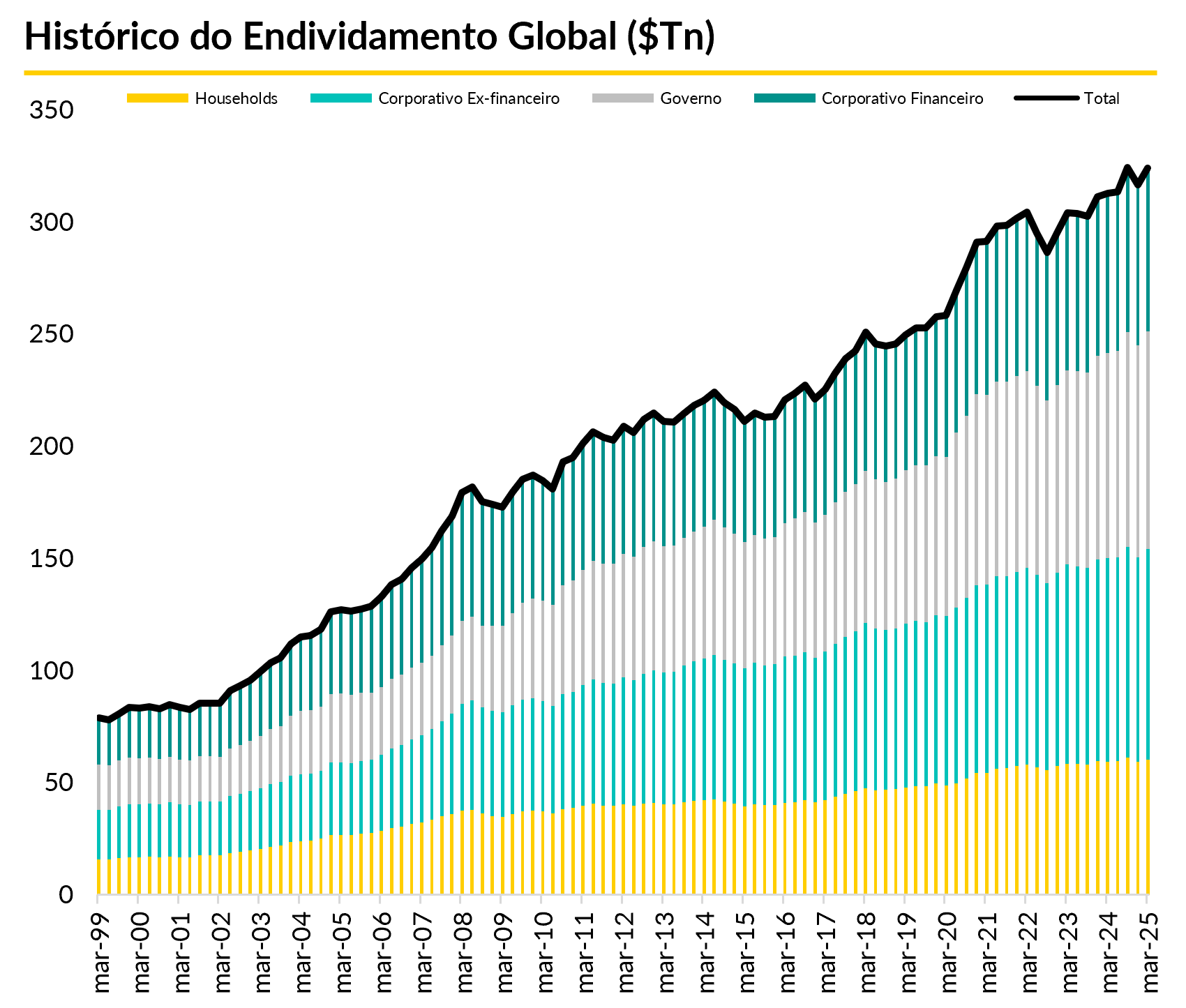 A dívida global ultrapassou US$325 trilhões, o maior nível já registrado, impulsionado pela pandemia, inflação persistente e tensões geopolíticas. O valor já representa mais de 300% do PIB mundial, com destaque para o crescimento da dívida pública e do setor financeiro desde a crise de 2008.