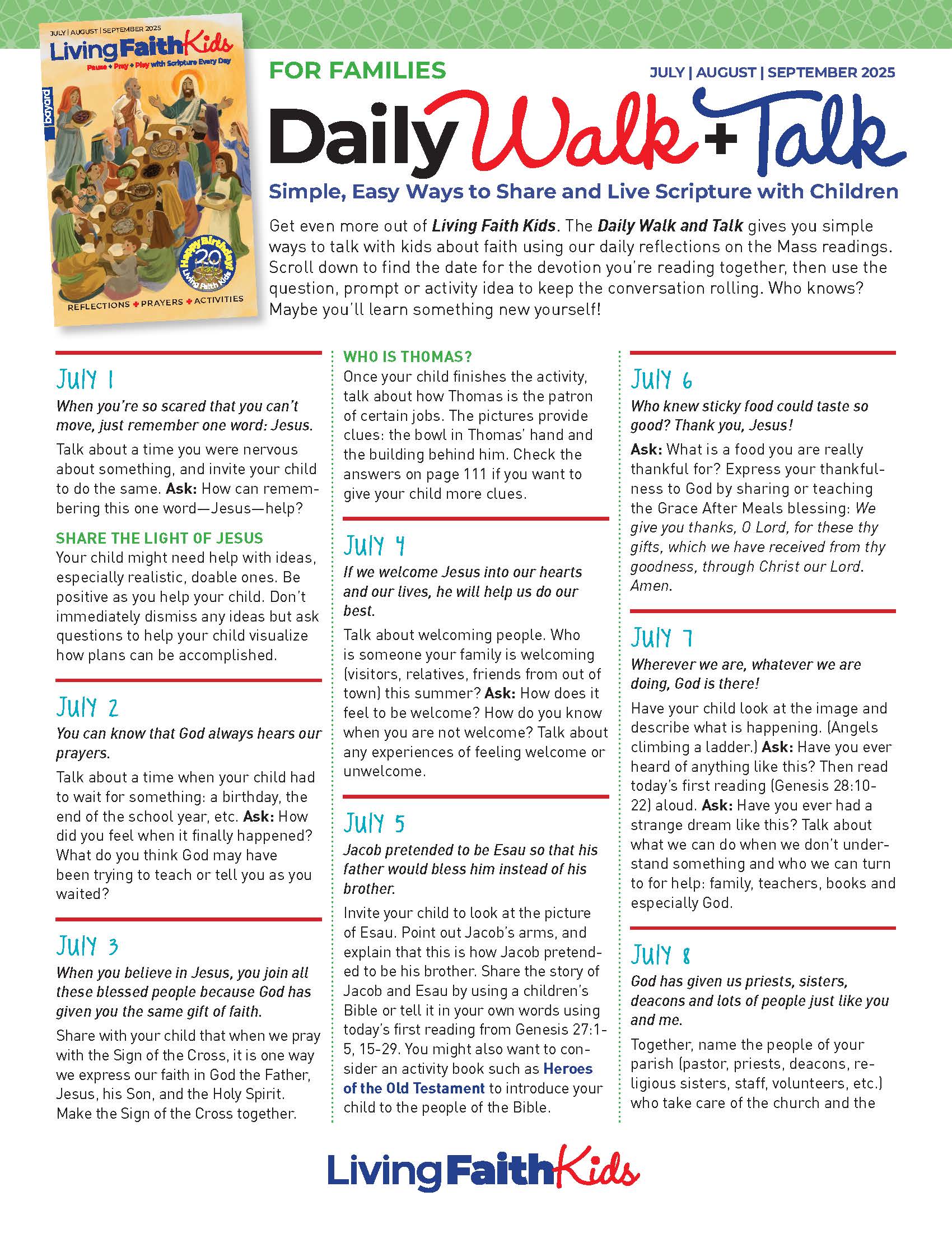 The Daily Walk + Talk is your go-to resource for meaningful faith conversations and activities at home, in classrooms, or parish settings. Designed to engage kids with reflections on the daily Mass readings, it offers simple questions, prompts, and activities to spark dialogue and enrich understanding. Download it today!