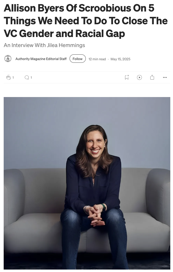 Allison Byers Of Scroobious On 5 Things We Need To Do To Close The VC Gender and Racial Gap An interview with Allison as part of Jilea Hemmings' series about “the five things we need to do to close the VC gender and racial gap”. |